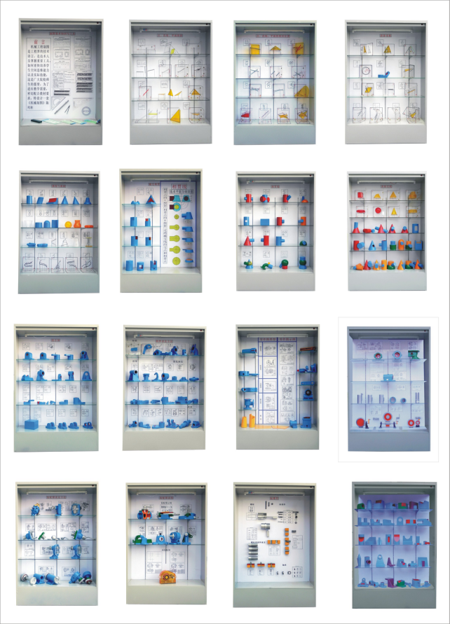 《機械制圖》陳列柜是根據大、中專院校、技校、職業學校的教材而設置的教學實驗室設備,目的是使學生加強對《機械制圖》的認識。本陳列柜主要包括零件的標準要素,常用標準件和標準部件及其標準數據,作圖方法和步驟以及圖樣等進行陳列,對機械專業的學生的理論學習,使用范圍等增強認識、加深理解,是機械專業學校提高教學質量的理想教具設備。本陳列柜共分16個柜,每個柜有每個柜的特點。