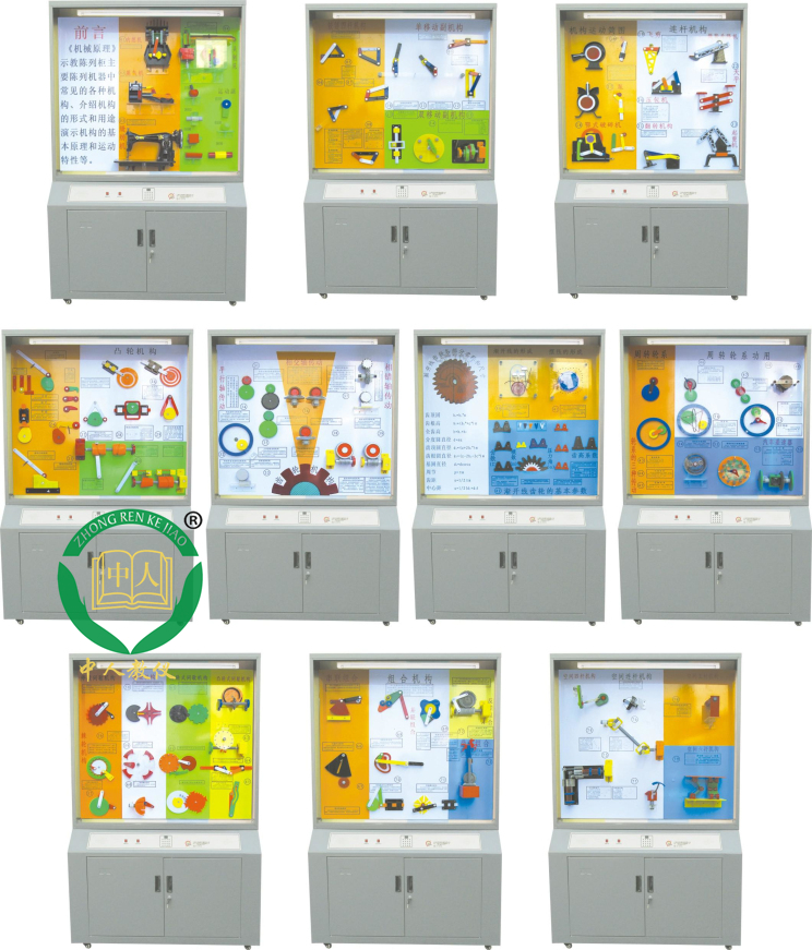 共分10柜,每柜能單獨通過柜上面板操控、講解、演示機械傳動原理。語言同時解說,與通過主控臺控制演示方法相比,具有使用簡單、演示直觀、維護方便的特點。柜身采用高檔三聚氰胺雙面飾面板制作,整體豪華、大氣、亮麗。