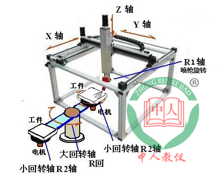6軸弧線噴涂機器人采用直角坐標形式,由X,Y,Z和槍頭旋轉R1,工件旋轉R2,送料臺回轉臺旋轉R3 6軸組成,采用“六軸聯動3D示教編程型控制系統”,任意二點確定空間直線,任意三點確定空間圓弧。