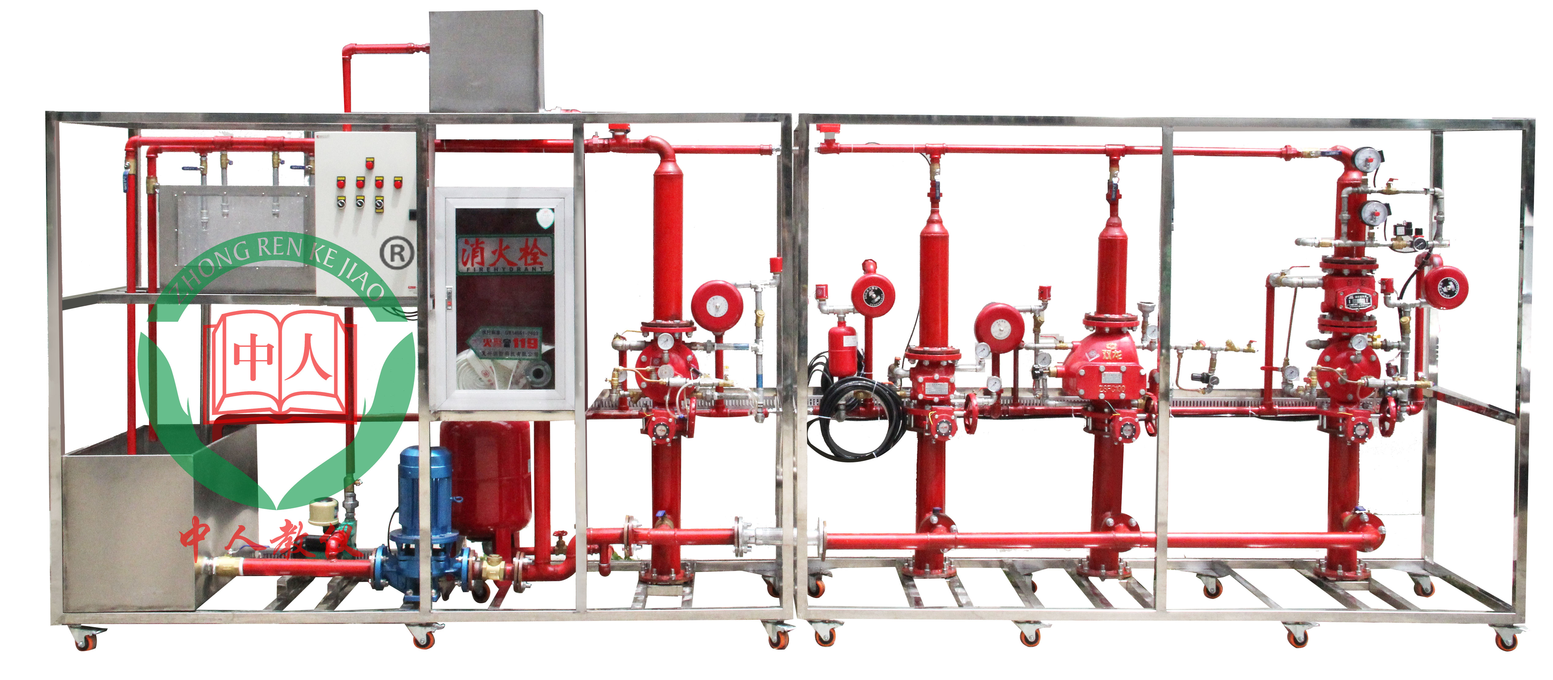 3)自動噴水滅火系統與消火栓系統共用低位消防水箱與屋頂消防水箱,并由消防水泵、穩壓增壓設備,氣泵、濕式報警閥,干式報警閥,雨淋報警閥,預作用報警閥,水流指示器,噴頭,末端試水裝置組成完整的自動噴水滅火系統,可以演示濕式自動噴水、干式、雨淋、預作用滅火系統的組成與工作原理。