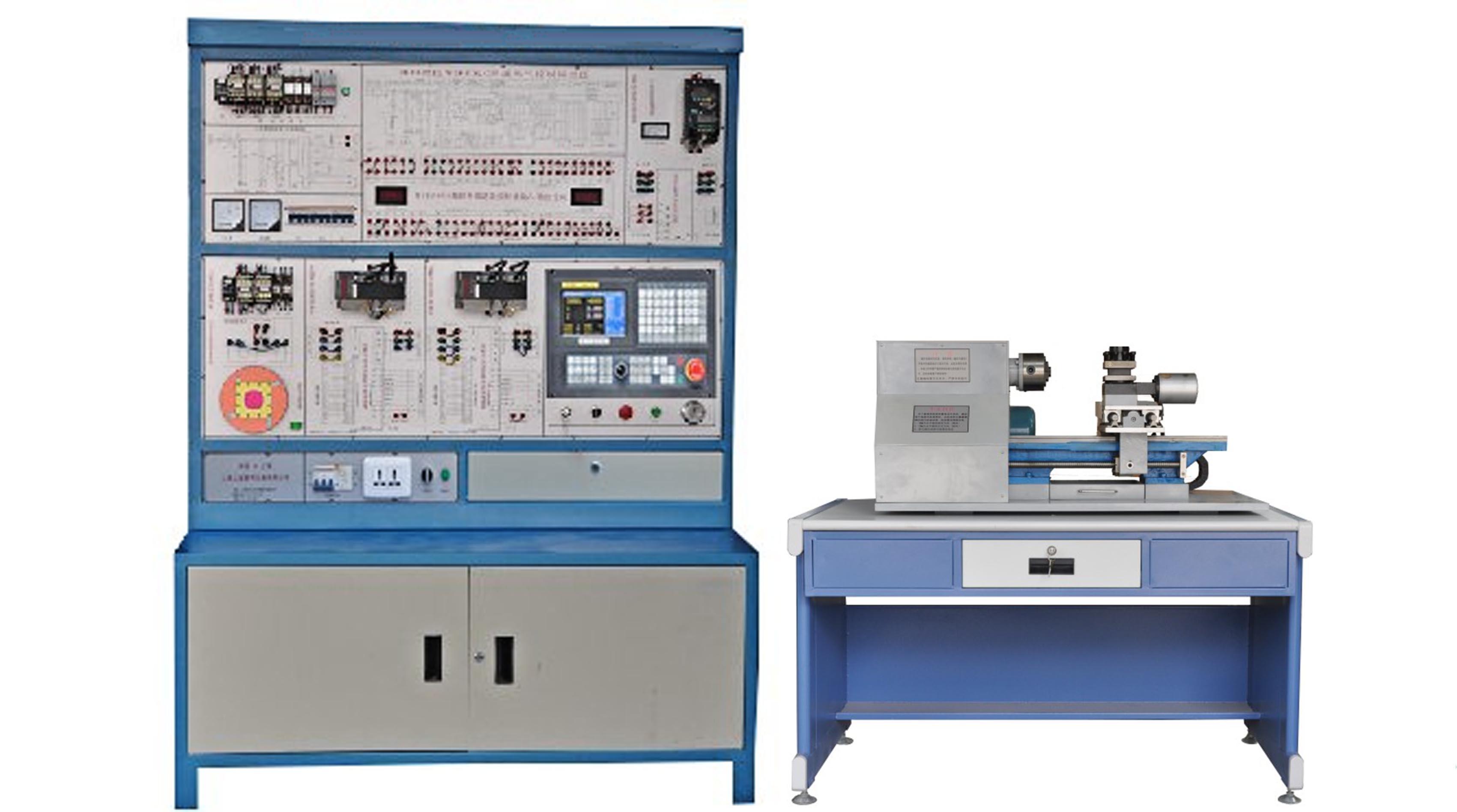 2.機(jī)床實訓(xùn)柜采用鐵質(zhì)亞光密紋噴塑結(jié)構(gòu),正面裝有數(shù)控系統(tǒng)和操作面板,器件與實際機(jī)床廠的模式一致。上面裝有變頻器、伺服驅(qū)動器、交流接觸器、繼電器、保險絲座、斷路器、開關(guān)電源等,柜內(nèi)裝有接線端子排和走線槽、變壓器等;電氣柜底部設(shè)計為空,給用戶預(yù)留盛放資料、工具等。