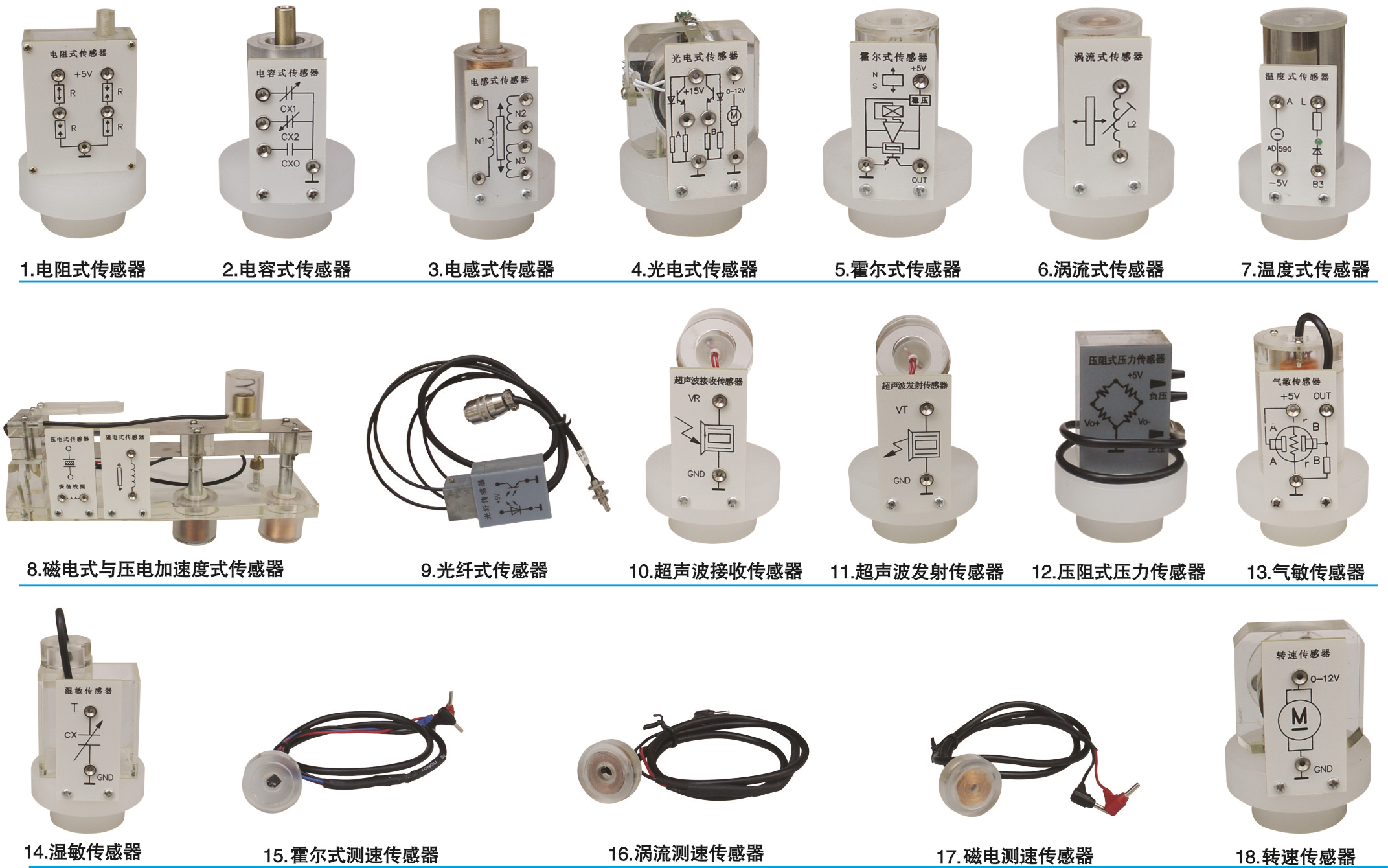 2、每種傳感器每個獨立,傳感器上印有原理圖與接線口,給學生做實驗時快捷方便,而且老師可以帶到課堂上講課用。