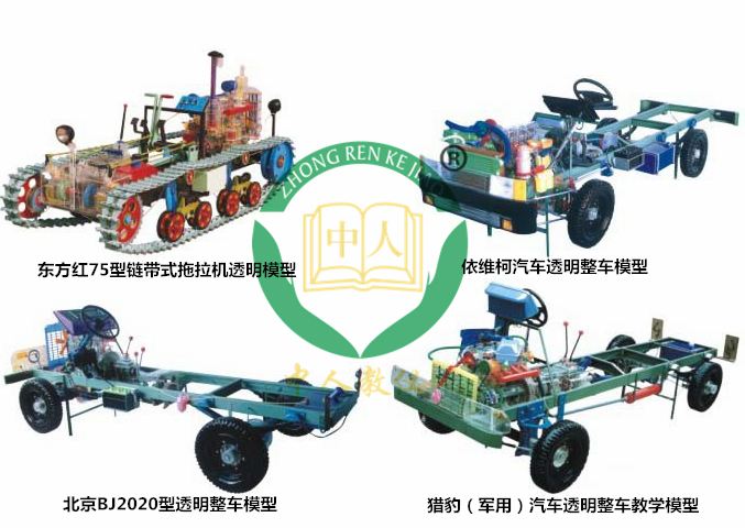 本品選用透明有機玻璃制作,內中部件均以硬質塑料料加工,用 螺絲固定在金屬高溫烘漆而成的車架上。各總成部分都以壓模成形加 工,代替過去膠粘合的方法,使產品在強度上有很大提高。發動機總成用電機驅動,在油門處設有調速裝置,能演示發動機轉速高低。離合器分離明顯,操縱靈活,離合器外殼整體壓模而成,變速箱和各檔齒輪用各種顏色表示,換檔靈活,手制動美觀。后橋外形壓模而成,內中主減速、差速轉動自如,輪轂剎蹄壓模成型,剎蹄可調節,前橋輪鼓可調整,轉向裝置以及電瓶、油箱、水箱,制動管路分布清楚一目了然。電路采用對插件前后分布,燈架、風窗、儀表板、后燈架用透明有機玻璃壓模成整體美觀逼真。