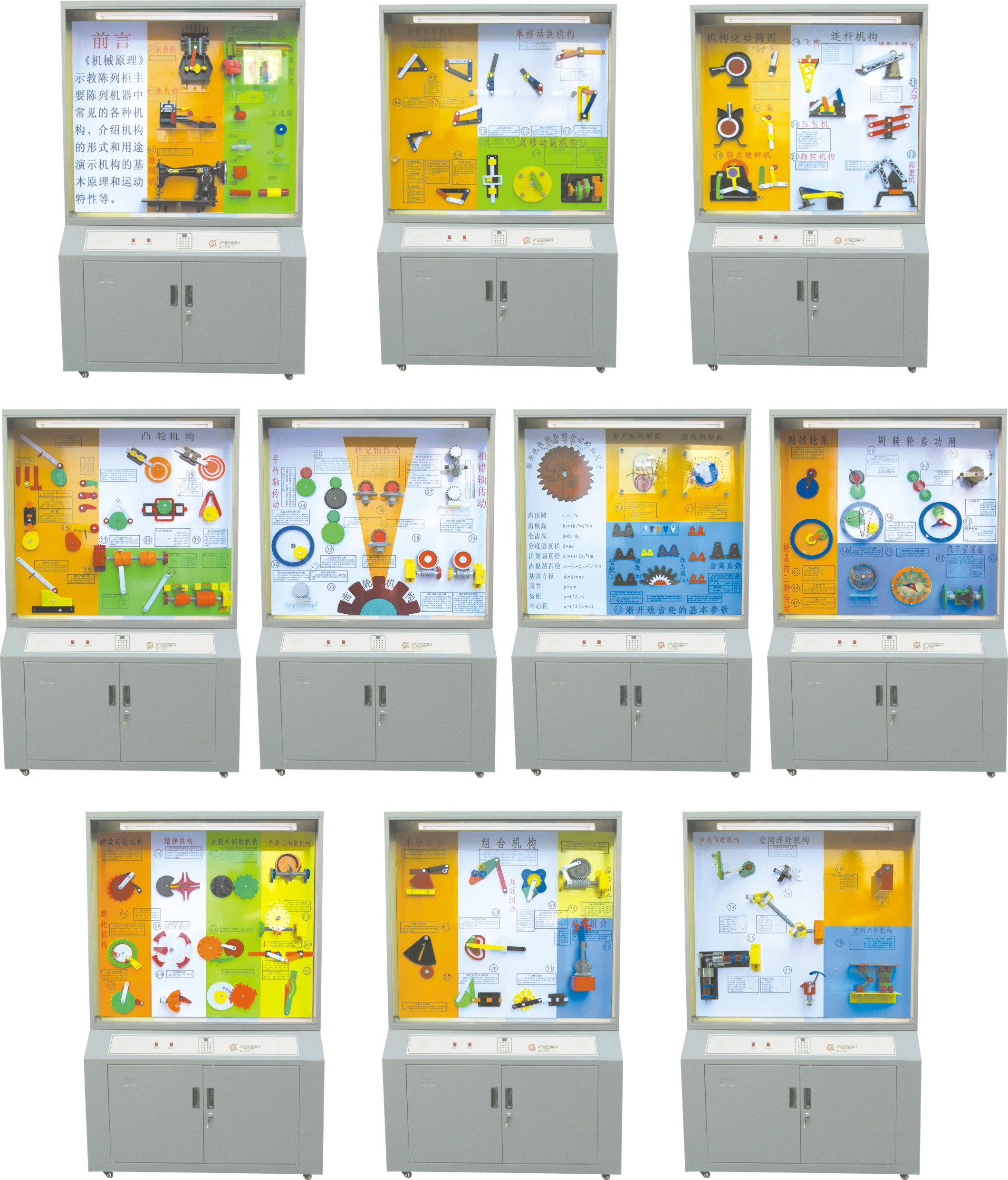 機械原理陳列柜是根據大、中專院校、技校、職業學校的機械原理教學大綱設計的電化教學設備。演示形象逼真,運行可靠,制作工藝美觀,使用本陳列柜可提高教學效果,節約學時是一套現代化機械課程教學應用實驗室設備。